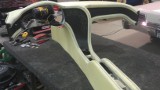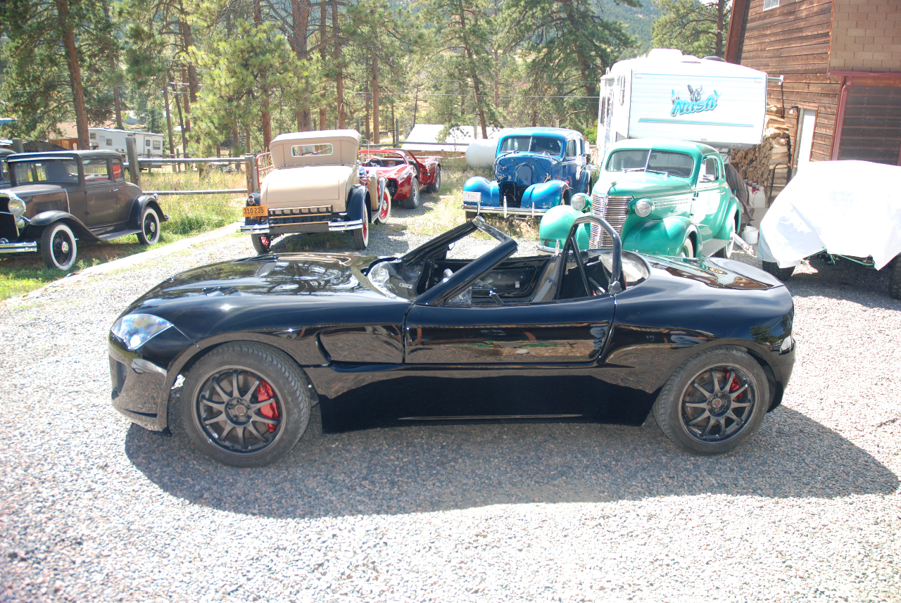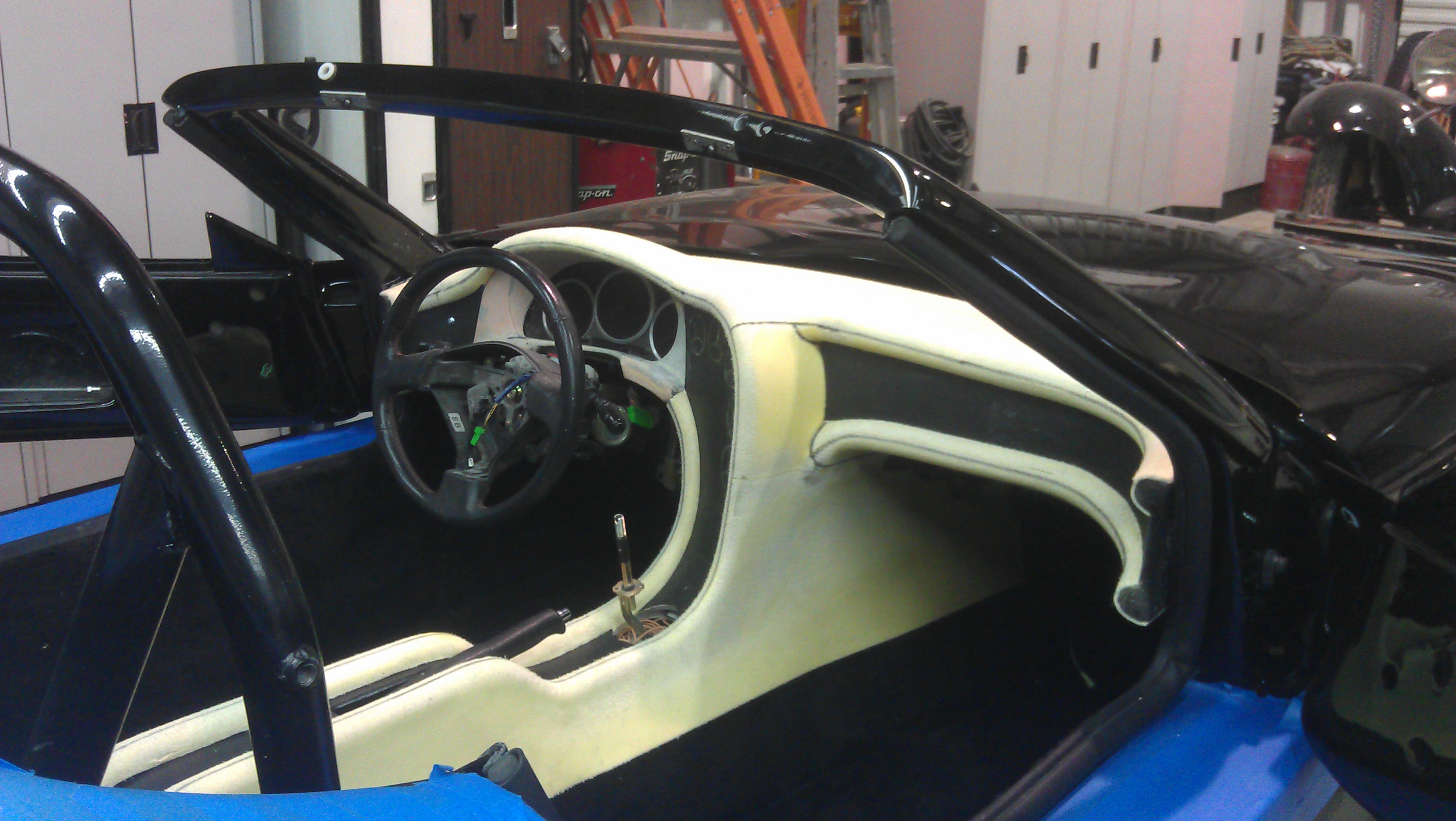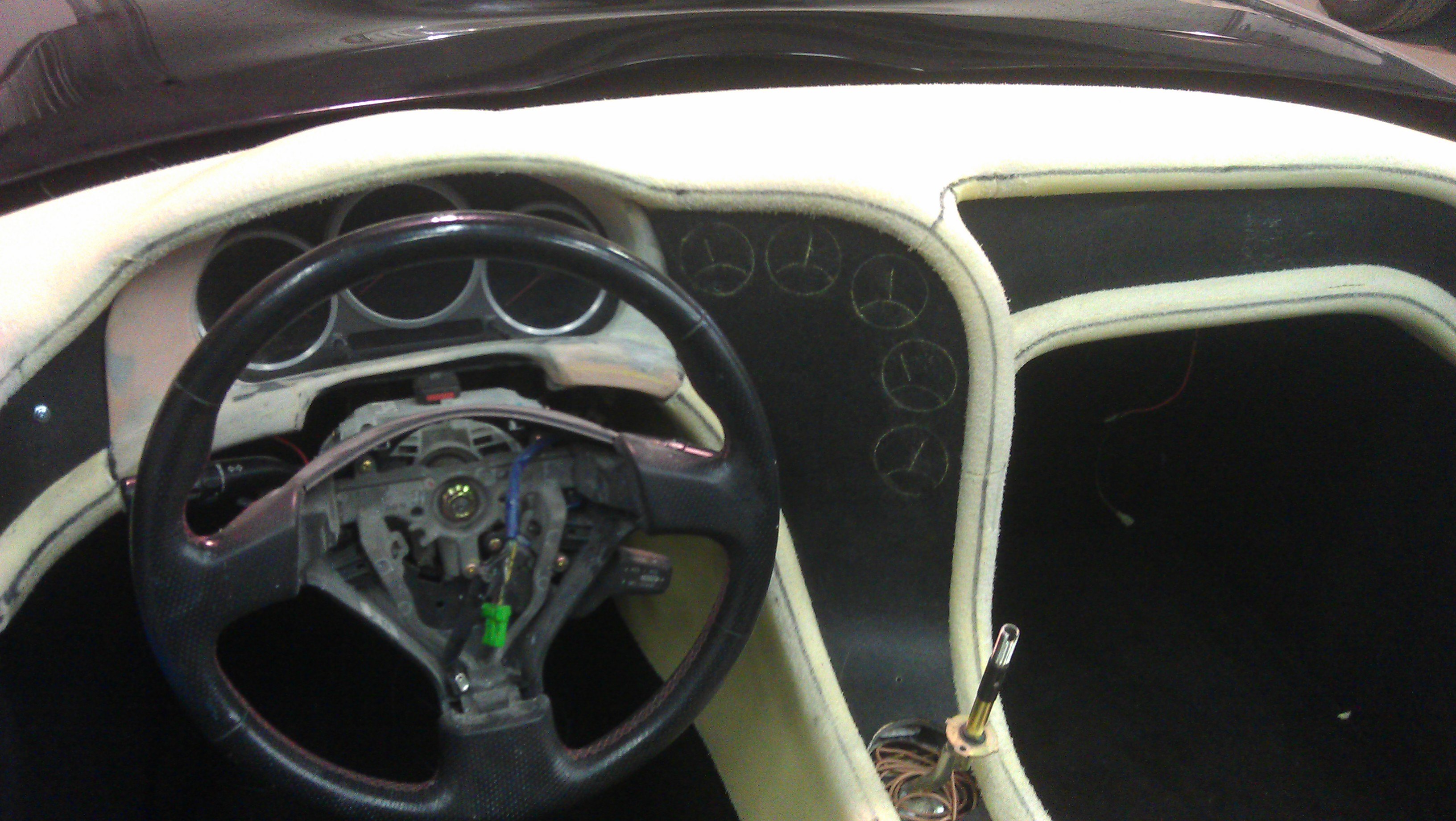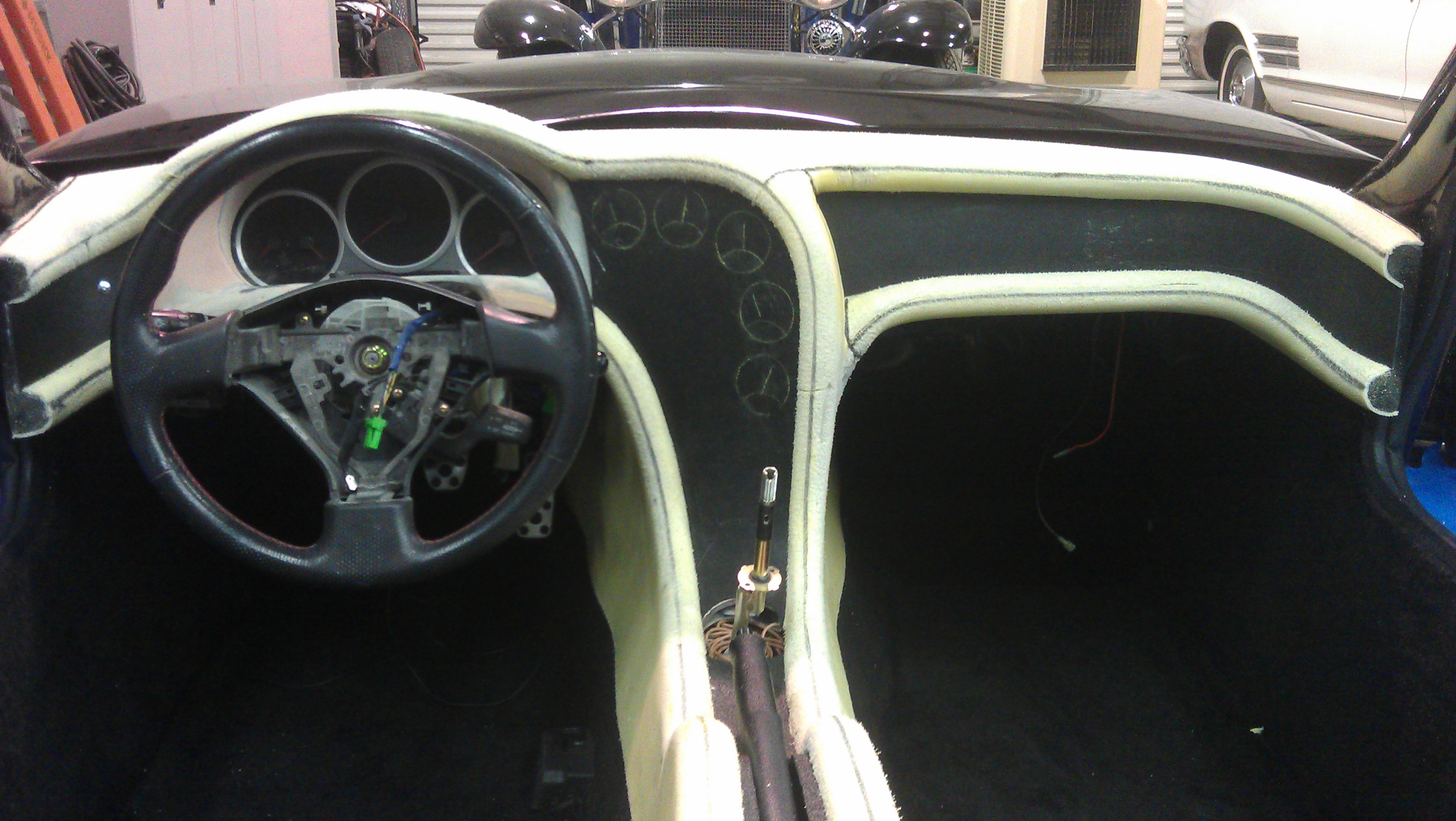 The body is rebuilt and refinished! Notice changes like the shaved intakes (no more lights or latches externally visible). Since we had some time until the interior could be tended to, I designed a new interior shape that wraps around the driver. The same guy who did the fantastic job on the body moulded the new design onto the dash. Old design: New design: Unfinished modifications: Waiting at the interior place... Ready to cover. The dials are shalked out, and black lines show where the stitching will go. |